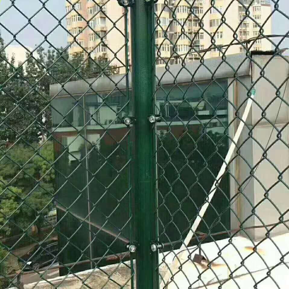 足球场围网表面处理:围网采用PE/PVC包塑丝,立柱、边框采用喷塑、浸塑处理